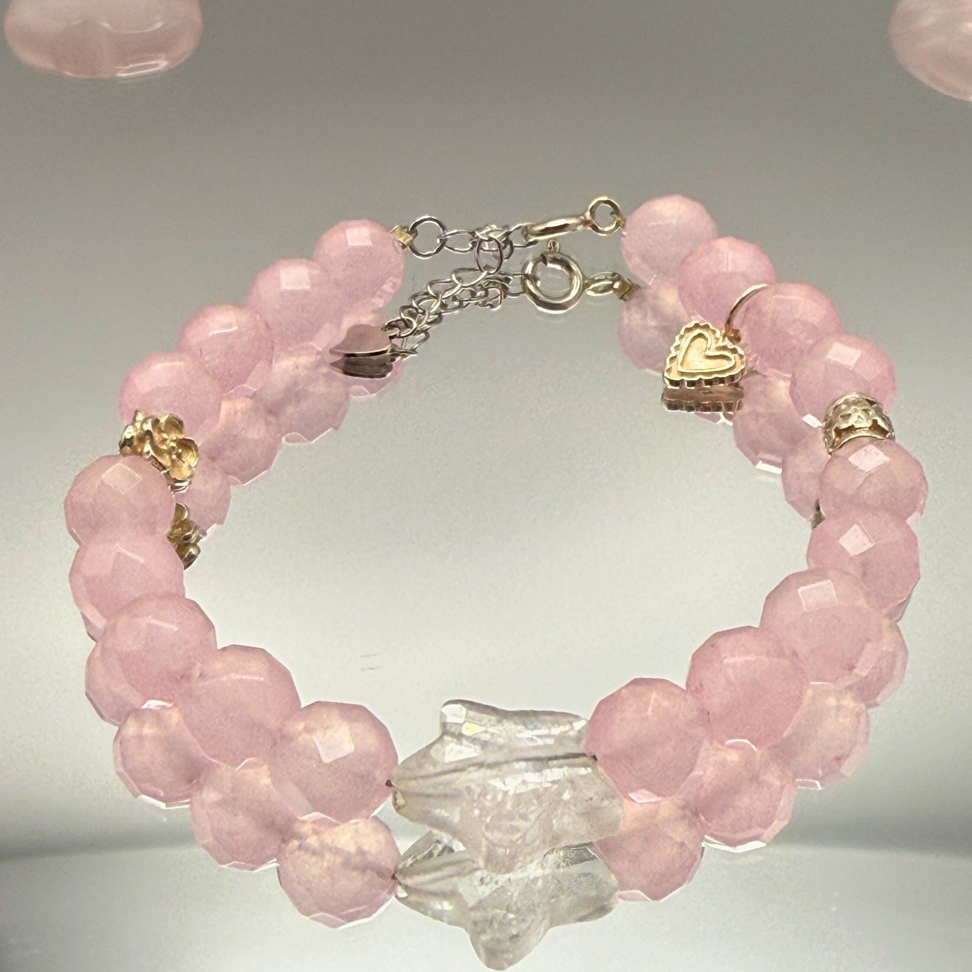 At the center, a rose quartz carved star adds a unique focal point, giving this,piece an elevated and delicate finish.