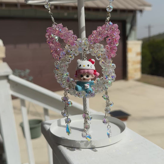 Handmade Dimoo inspired crystal heart suncatcher. Sparkly pink beaded hanging charm for car mirror or window. Perfect kawaii decor gift.