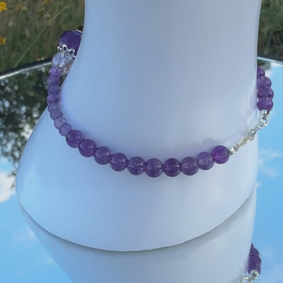 A unique piece celebrating the rich beauty of amethyst, the official February birthstone. This bracelet features a mix of faceted and smooth amethyst beads in various sizes, paired with soft lavender quartz accents. The different cuts and shades give this piece depth, elegance, and sparkle perfect for daily wear or as a meaningful gift.